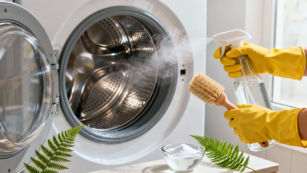 • Trapped Moisture: Modern high-efficiency machines are fantastic for your water bill, but they use less water. This means moisture can get trapped and linger in places like the rubber door gasket, the detergent dispenser, and even under the drum itself.